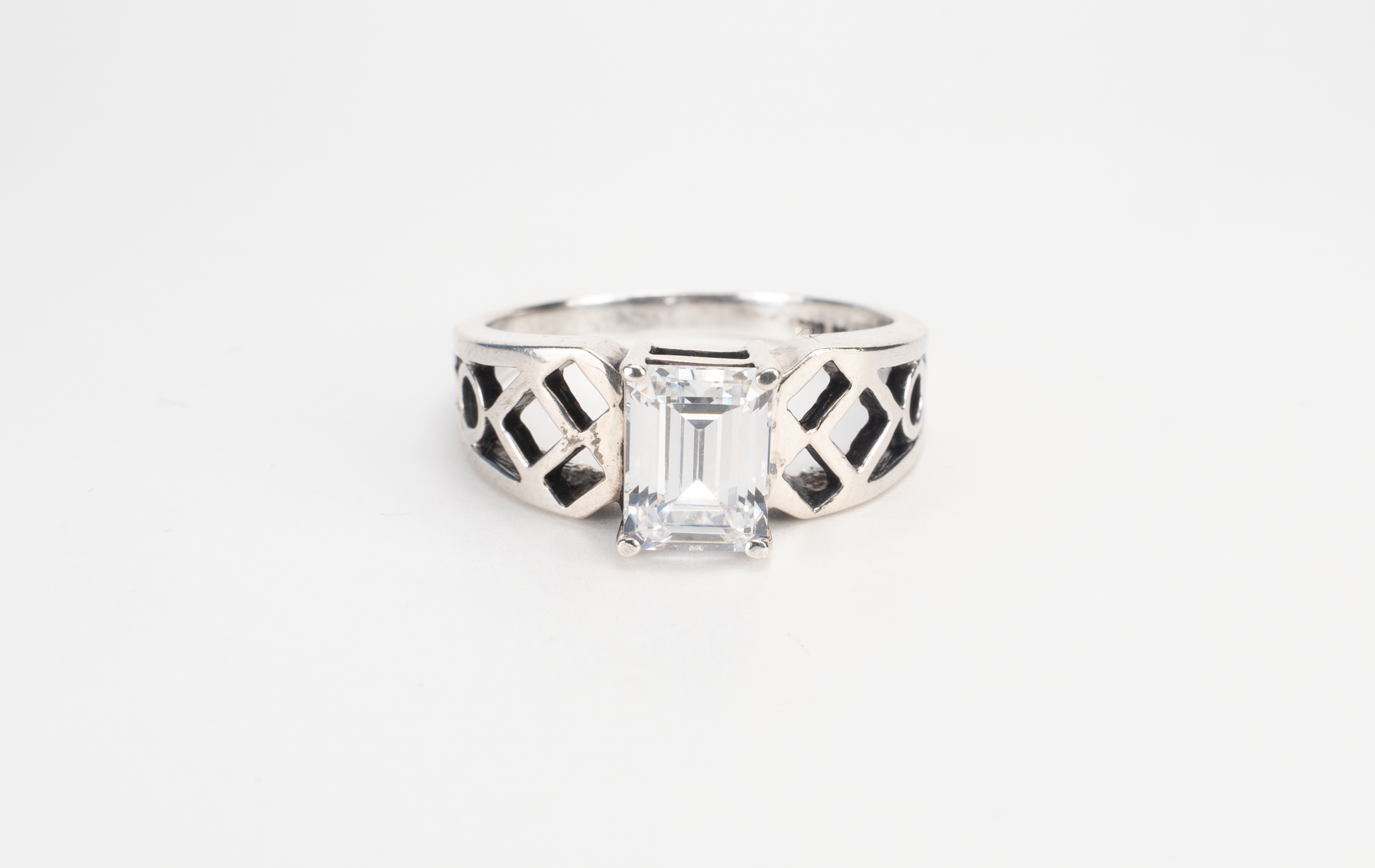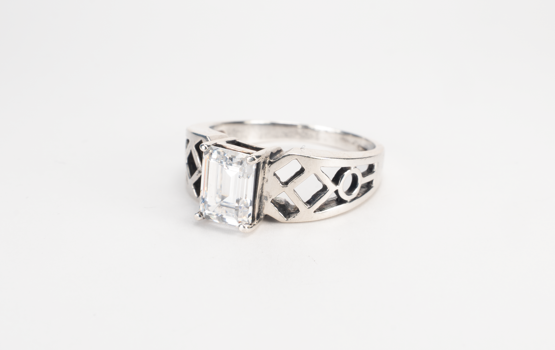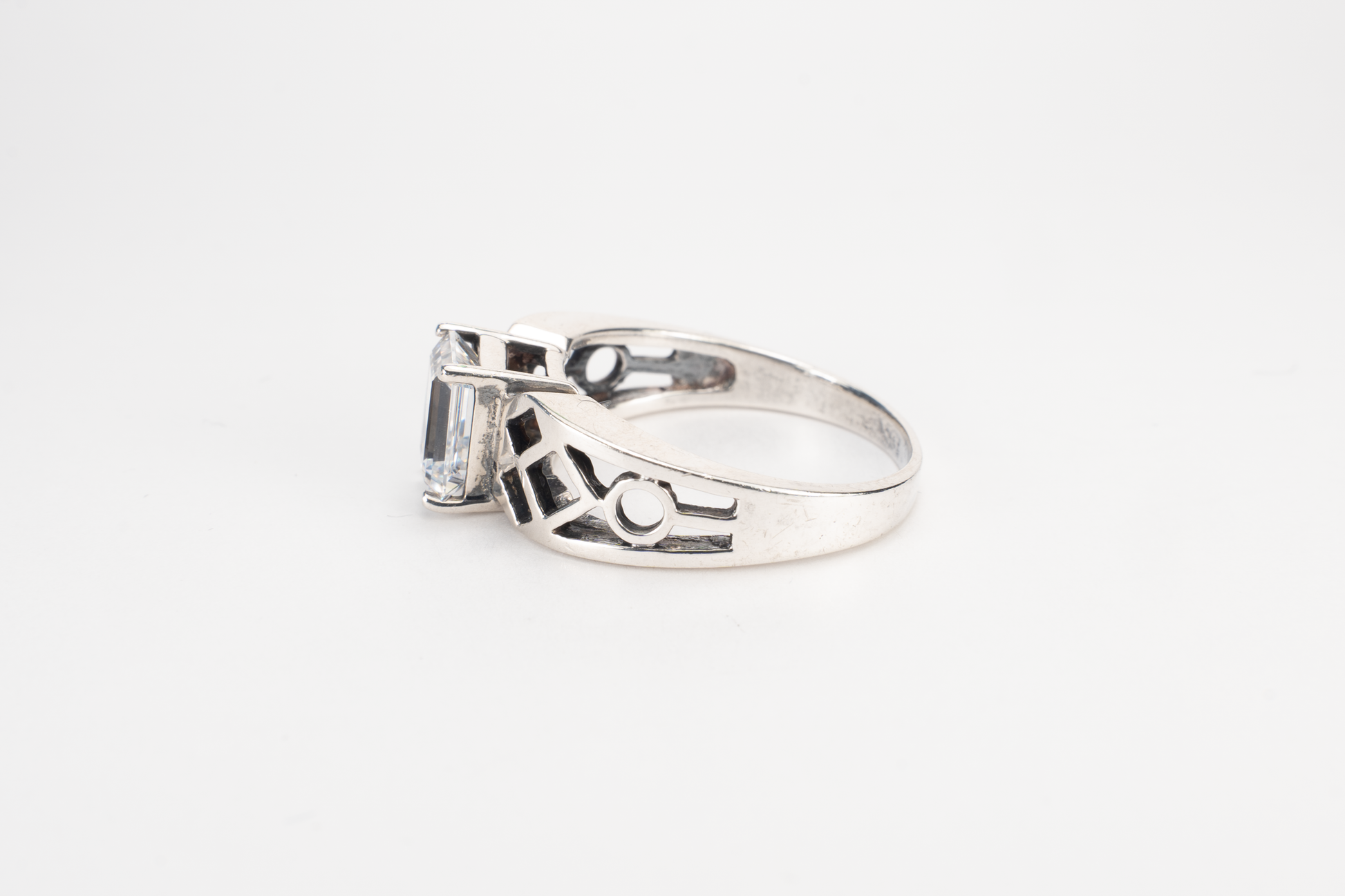 A wide band and patterned silver ring featuring a large, emerald cut zirconia stone.